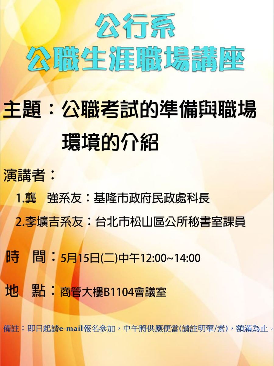 【公告】淡江大學公行系 公職生涯職場講座﹝公職考試的準備與職場環境的介紹﹞5/15(二)中午12:00~14:00於B1104~備有午餐,名額有限,歡迎踴躍報名參加
